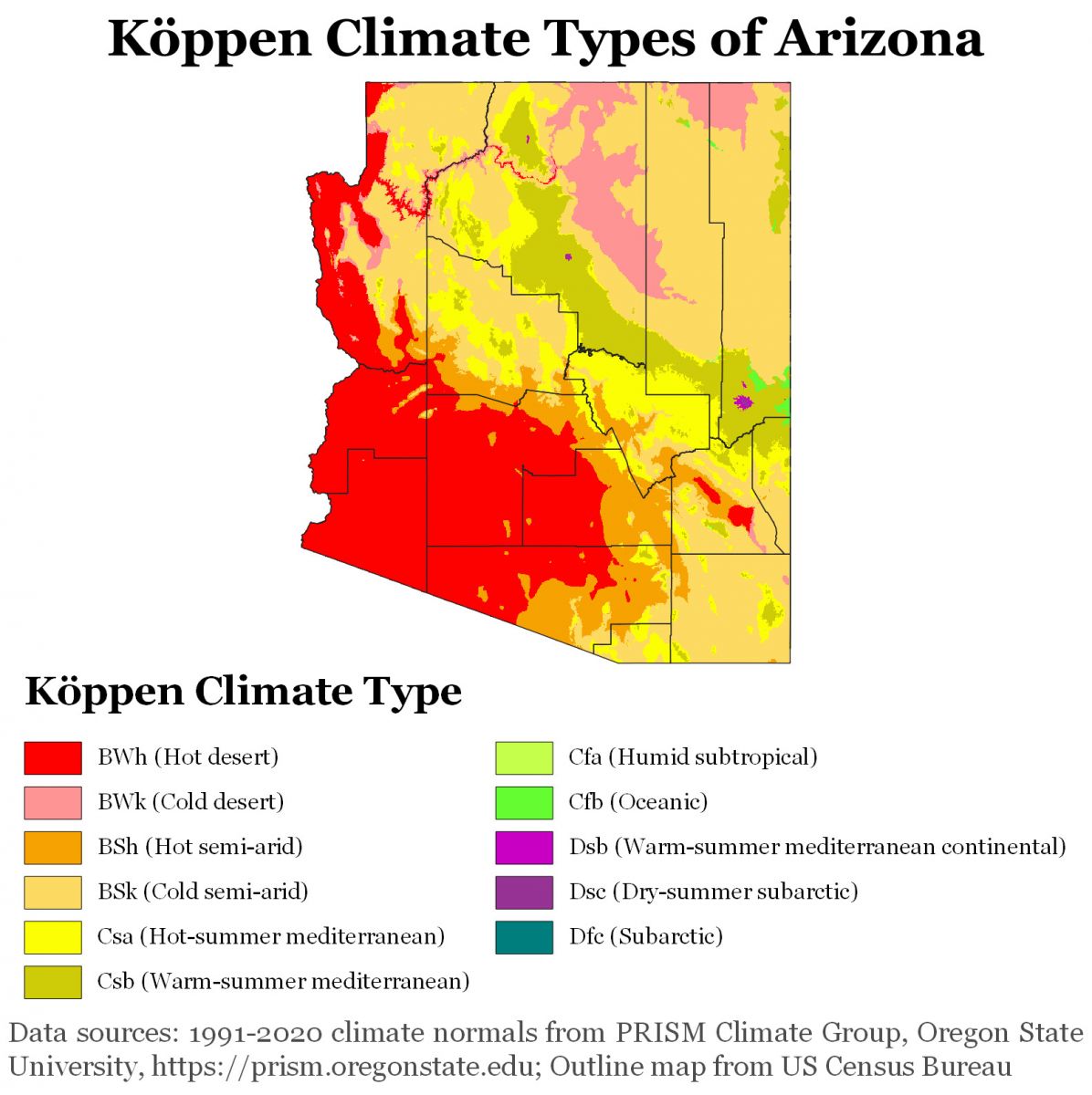 La stragrande maggioranza dello stato presenta il clima “BSk”, ovvero quello semi-arido freddo, caratterizzato da precipitazioni molto scarse ed Inverni freddi. Nel Nord dell’Arizona questo clima si trasforma, dove piove ancora di meno, nel “BWk”, ovvero il desertico freddo.