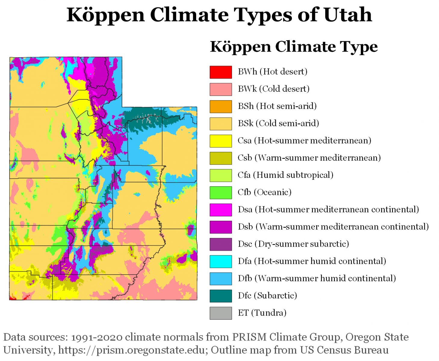Alcuni luoghi dell’Utah presentando anche un clima mediterraneo: i climi “Csa” e “Csb” si trovano a quote un po’ maggiori, dove le precipitazioni non sono così scarse ma dove comunque resta siccitoso il trimestre Estivo. La differenza tra i due è la temperatura media del mese più caldo, superiore ai 22 gradi nel primo e inferiore a tale soglia nel secondo.