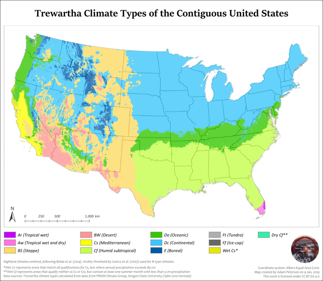 Per mesi e mesi abbiamo analizzato il clima degli States stato per stato utilizzando la classificazione climatica globalmente più utilizzata: quella di Köppen. Tuttavia, come anticipato, questo sistema è molto buono per scale continentali ma, già per scale nazionali come nel nostro caso, può diventare poco rappresentativo in alcune zone vista la sua generalità. Per questo motivo la classificazione dei climi di Köppen è stata rivisitata e modificata dallo scienziato americano Trewartha nella seconda metà del secolo scorso, il quale ha integrato il sistema climatico Köppen con alcuni accorgimenti che hanno reso più precisa la classificazione climatica dello scienziato tedesco. Analizzeremo quindi, da oggi e per alcuni giorni a seguire, la classificazione climatica di Trewartha per gli Stati Uniti procedendo per macrozone, confrontandola, anche visivamente, con quella di Köppen e spiegandone differenze e analogie (il periodo climatico di riferimento è 1981-2010). Cominciamo!