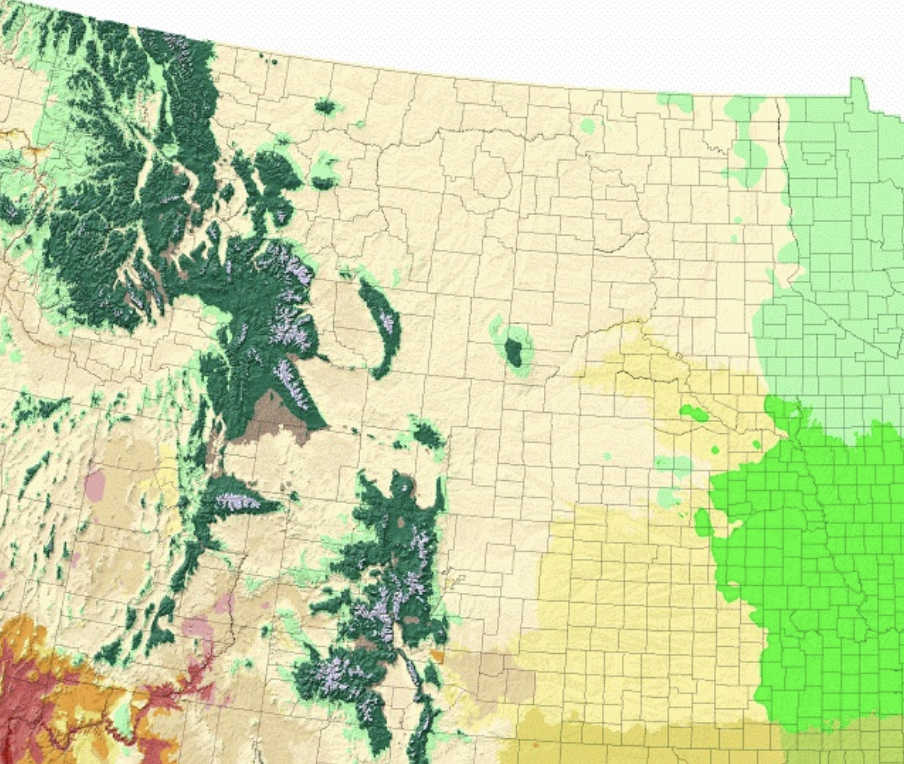 Salendo di quota, negli stati del Montana e del Wyoming (e localmente in Sud Dakota) domina il clima “humid boreal”, boreale umido, il quale, a quota ancora più elevata, in Montana è un Wyoming, cede il passo al clima di alta quota “alpine”, alpino, indicato in viola chiaro nella mappa.