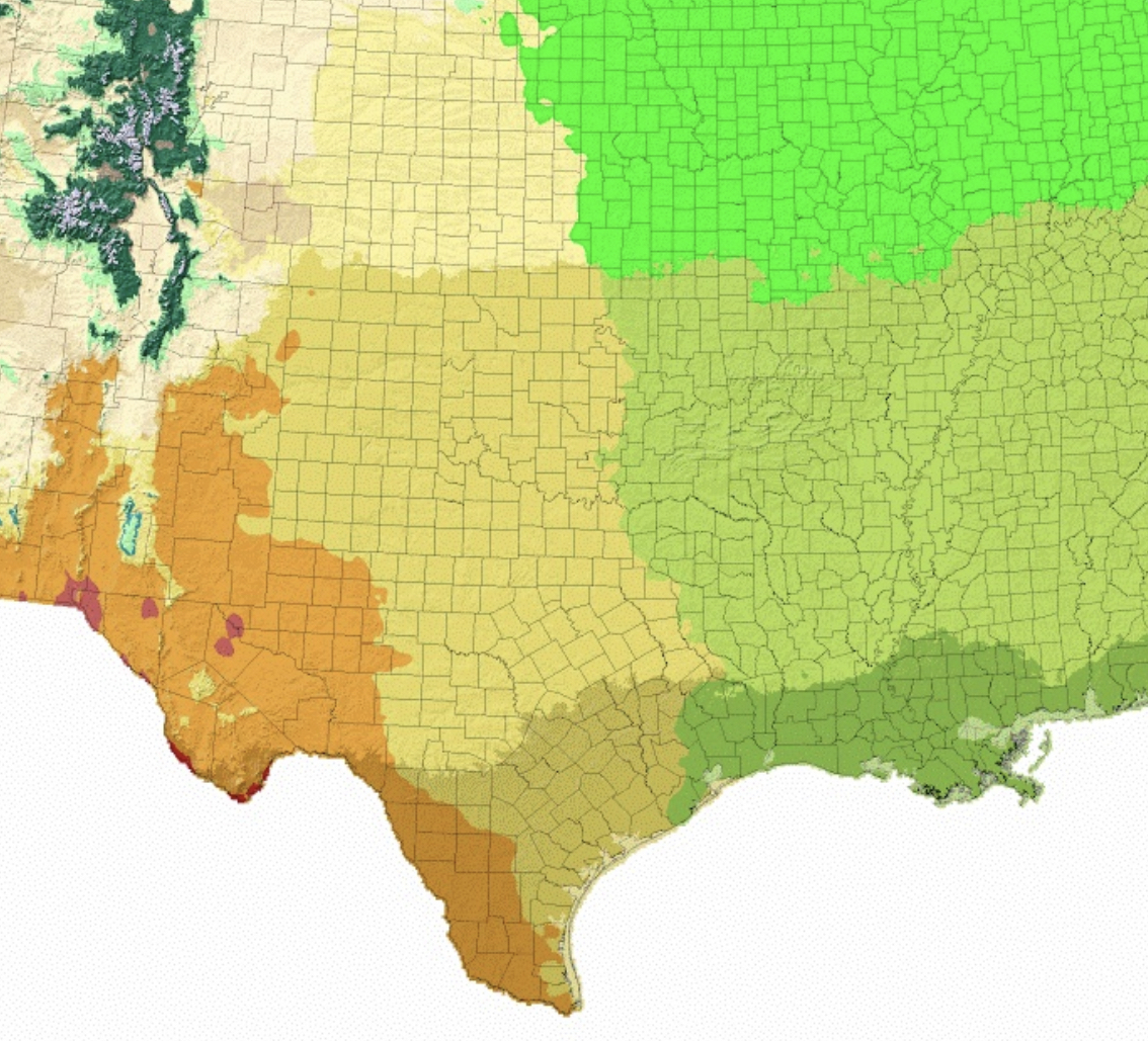 Infine, ancora più a Sud-Ovest, dove le precipitazioni sono scarse, in Texas occidentale, troviamo altri 4 climi: “semiarid warm temperate”, clima temperato caldo semiarido; “semiarid tropical”, clima tropicale semiarido; dove invece le piogge sono quasi del tutto assenti, troviamo i climi “arid warm temperate”, clima temperato caldo arido, e “arid tropical”, clima tropicale arido.