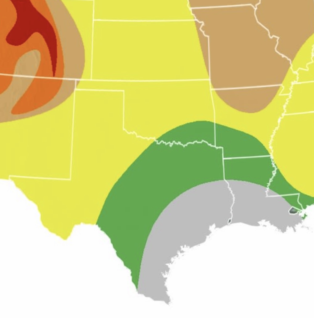 In quest’area degli Stati Uniti si nota una maggiore termicità del clima, vista la latitudine minore: il picco dei colori autunnali viene raggiunto, mediamente, nell’ultima decade di Ottobre (“Late October”) in quasi tutto il Kansas e l’Oklahoma e in buona parte di Arkansas e Texas; le uniche zone dove questo momento avviene prima, a metà Ottobre, sono il Nord dell’Arkansas, l’estremo Est del Kansas e una minuscola porzione dell’estremo Ovest dell’Oklahoma. Procedendo, il picco di foliage viene raggiunto a Novembre, solitamente nella prima decade, in buona parte del Texas e della Louisiana, oltre che in parte di Oklahoma e Arkansas; infine, non si registra nessun foliage per assenza di essenze arboree decidue o per assenza di alberi in tutto il Sud-Est del Texas e nel Centro-Sud della Louisiana.
