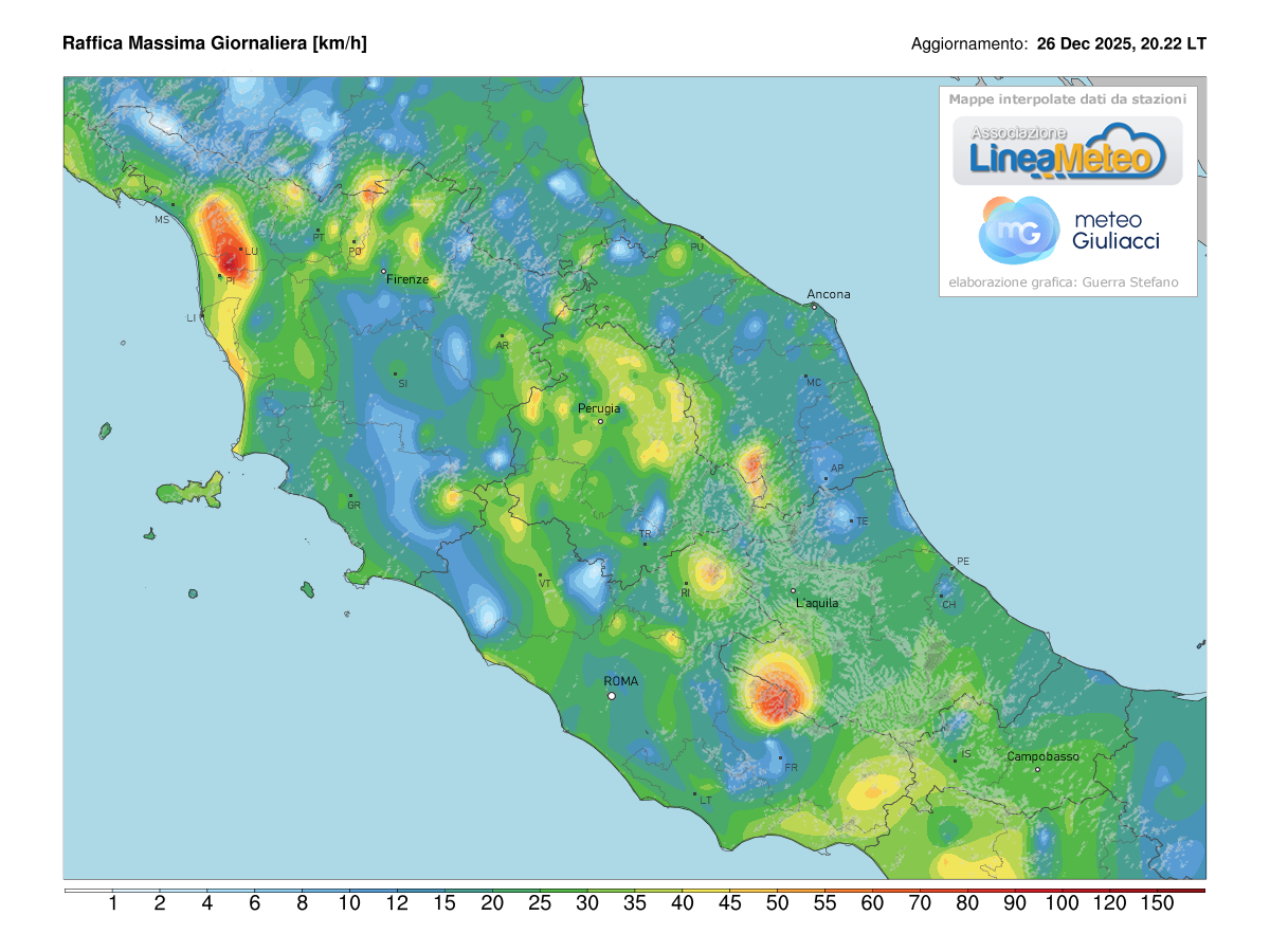 La mappa indica le raffiche massime registrate oggi sulle regioni del centro