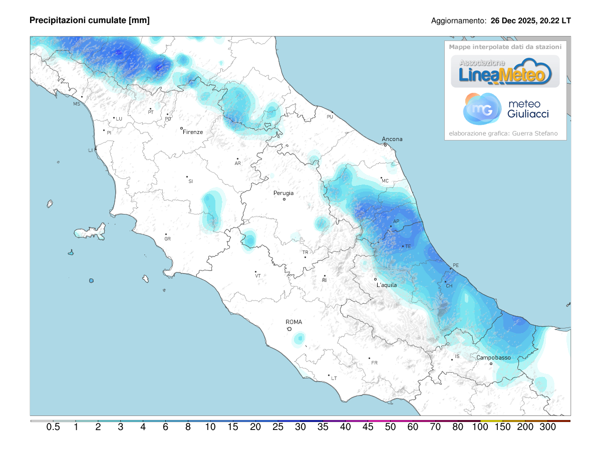 La mappa indica le precipitazioni accumulate oggi sulle regioni del centro