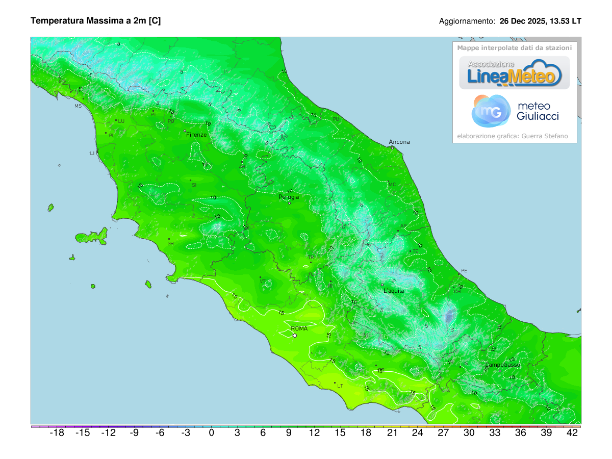 La mappa indica i valori massimi delle temperature registrate sulle regioni del centro oggi