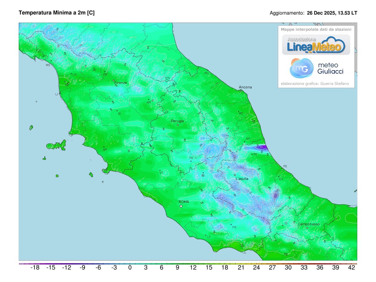La mappa indica i valori minimi delle temperature registrate sulle regioni del centro oggi