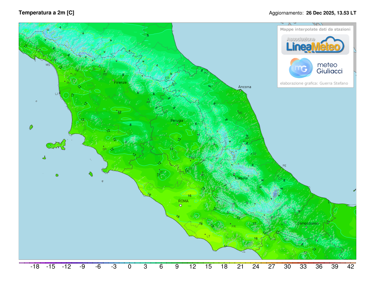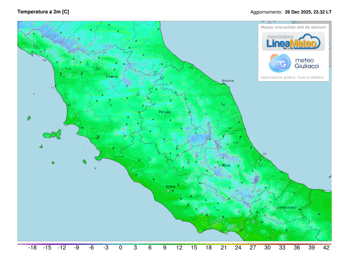 La mappa indica la situazione attuale aggiornata delle temperature registrate sulle regioni del centro