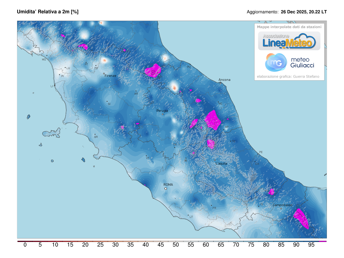 La mappa indica i valori di umidità relativa attuale registrata sulle regioni del centro