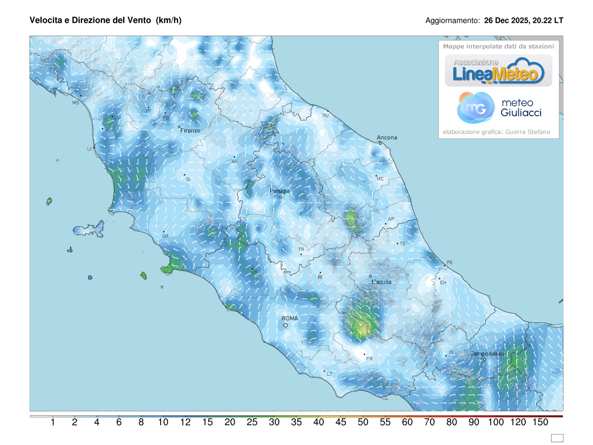 La mappa indica l'intensità del vento attuale registrata sulle regioni del centro