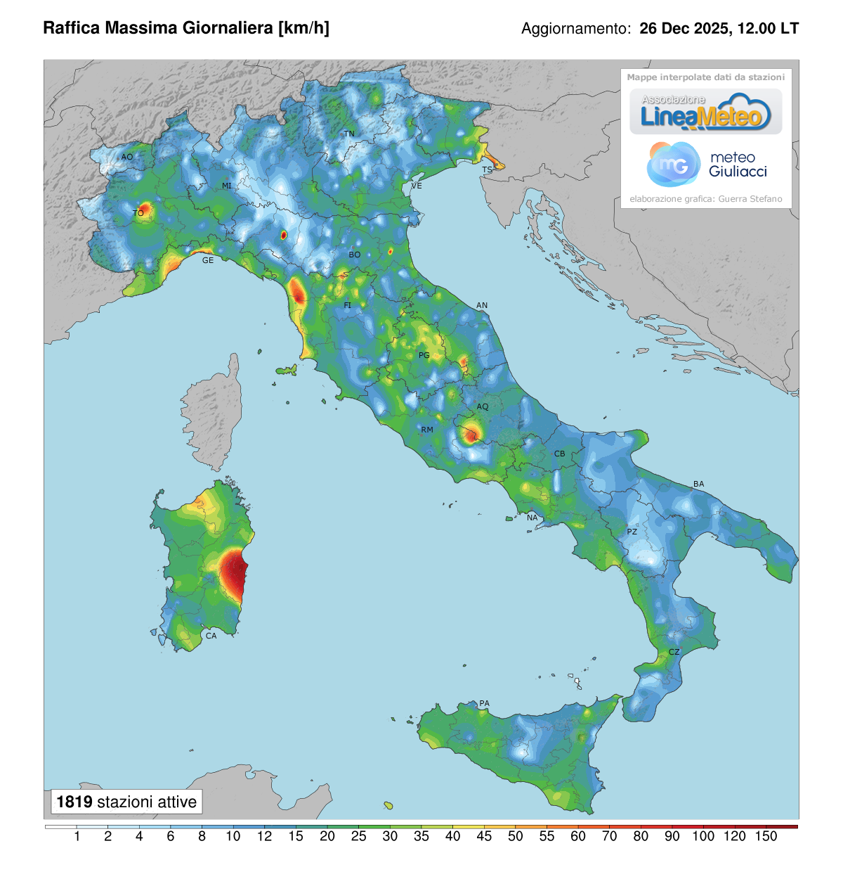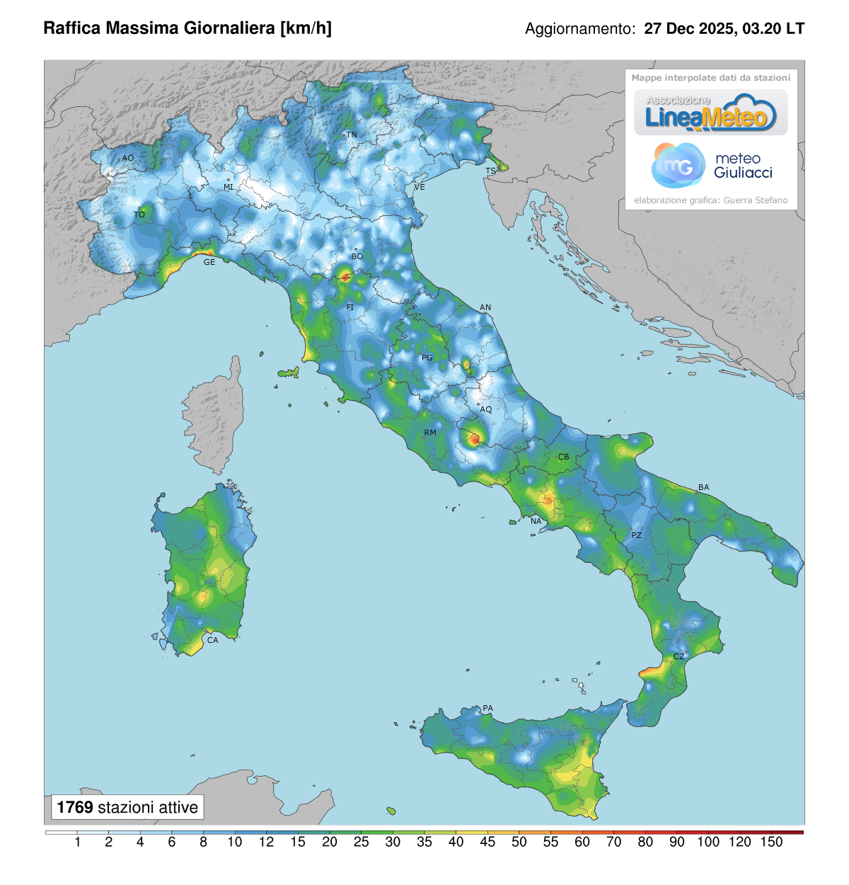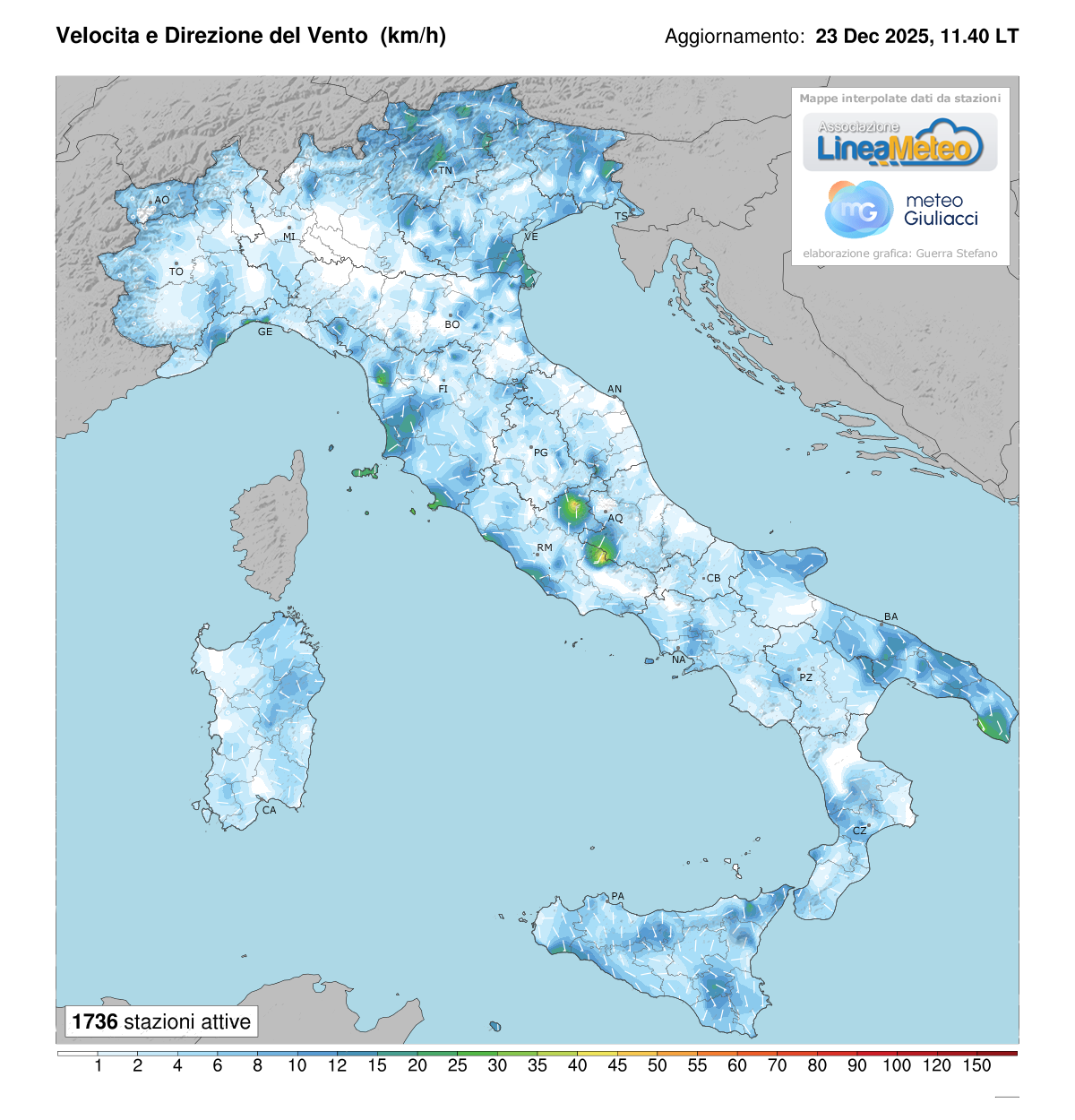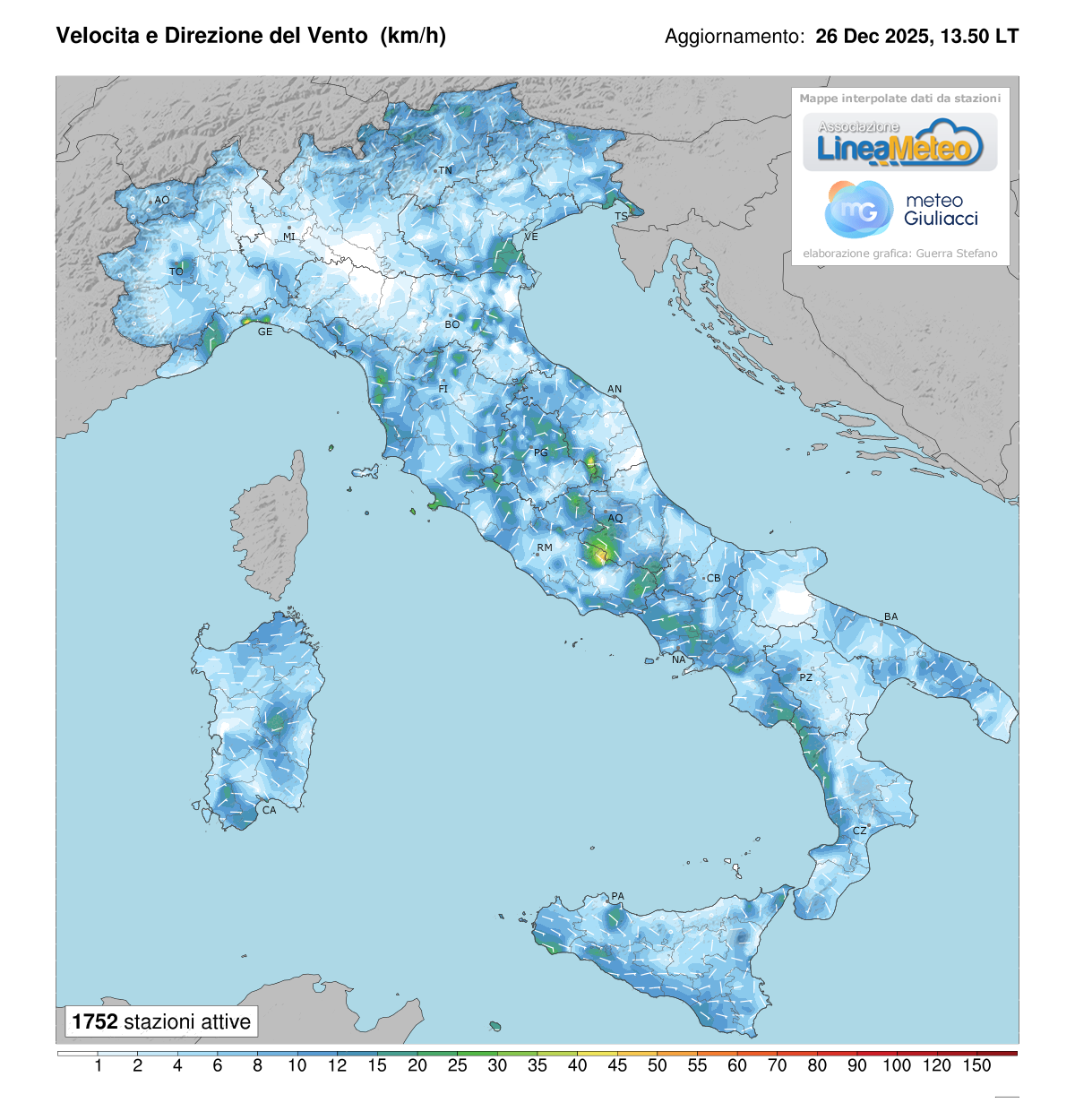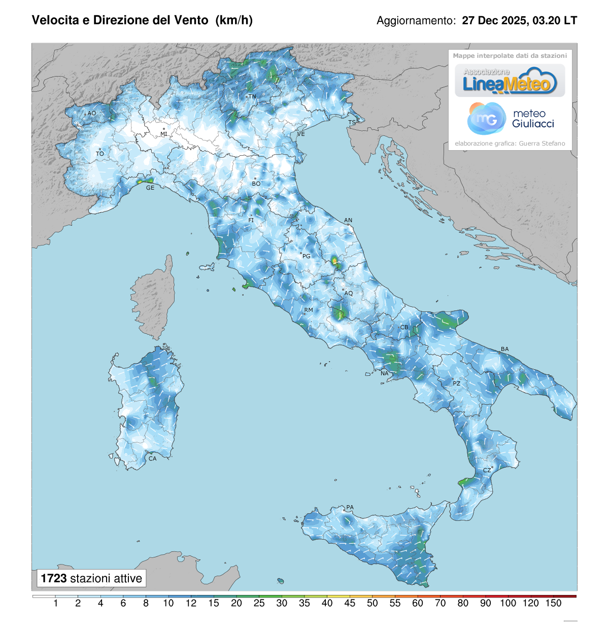 La mappa indica l'intensità del vento attuale registrata in Italia