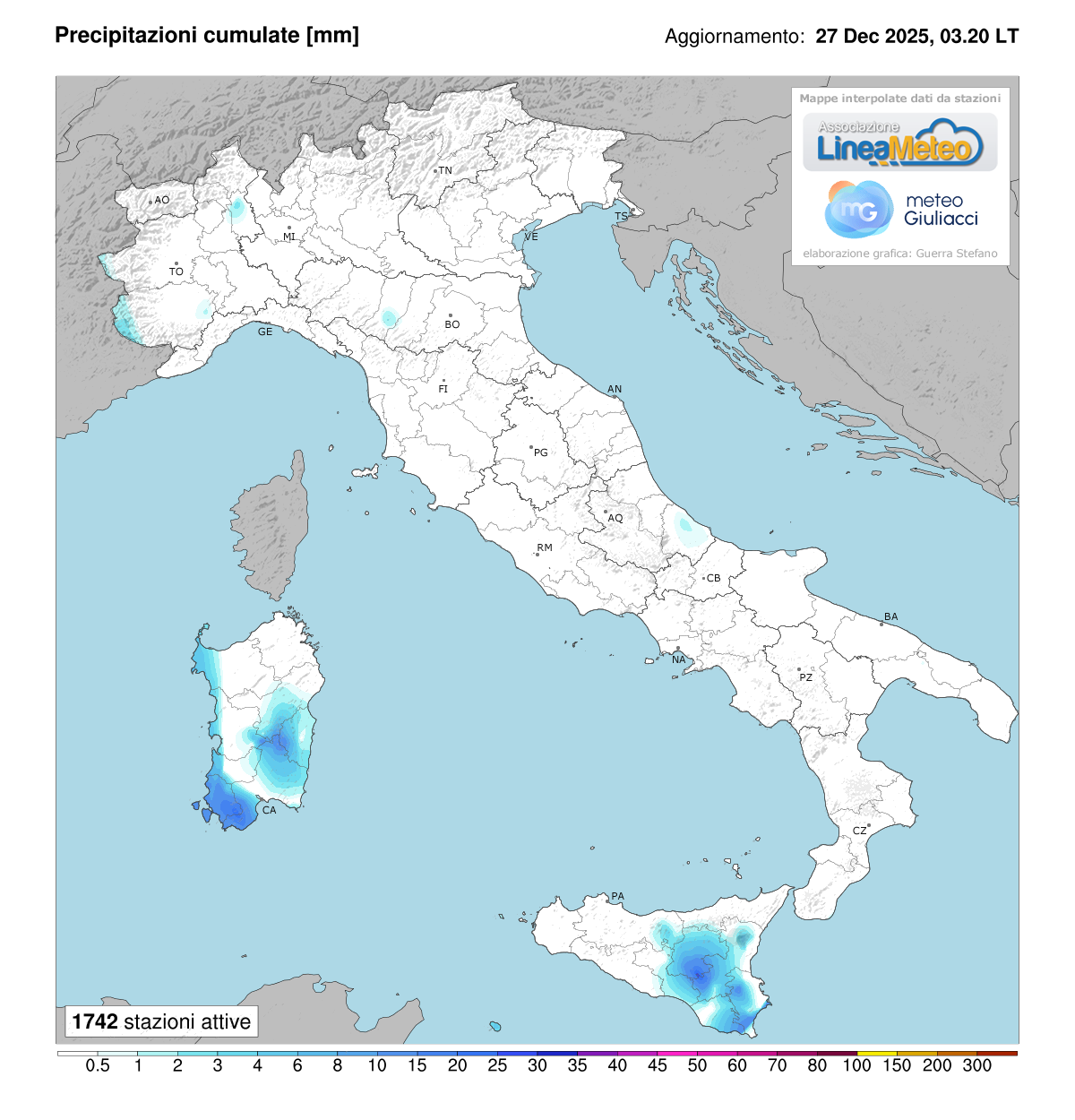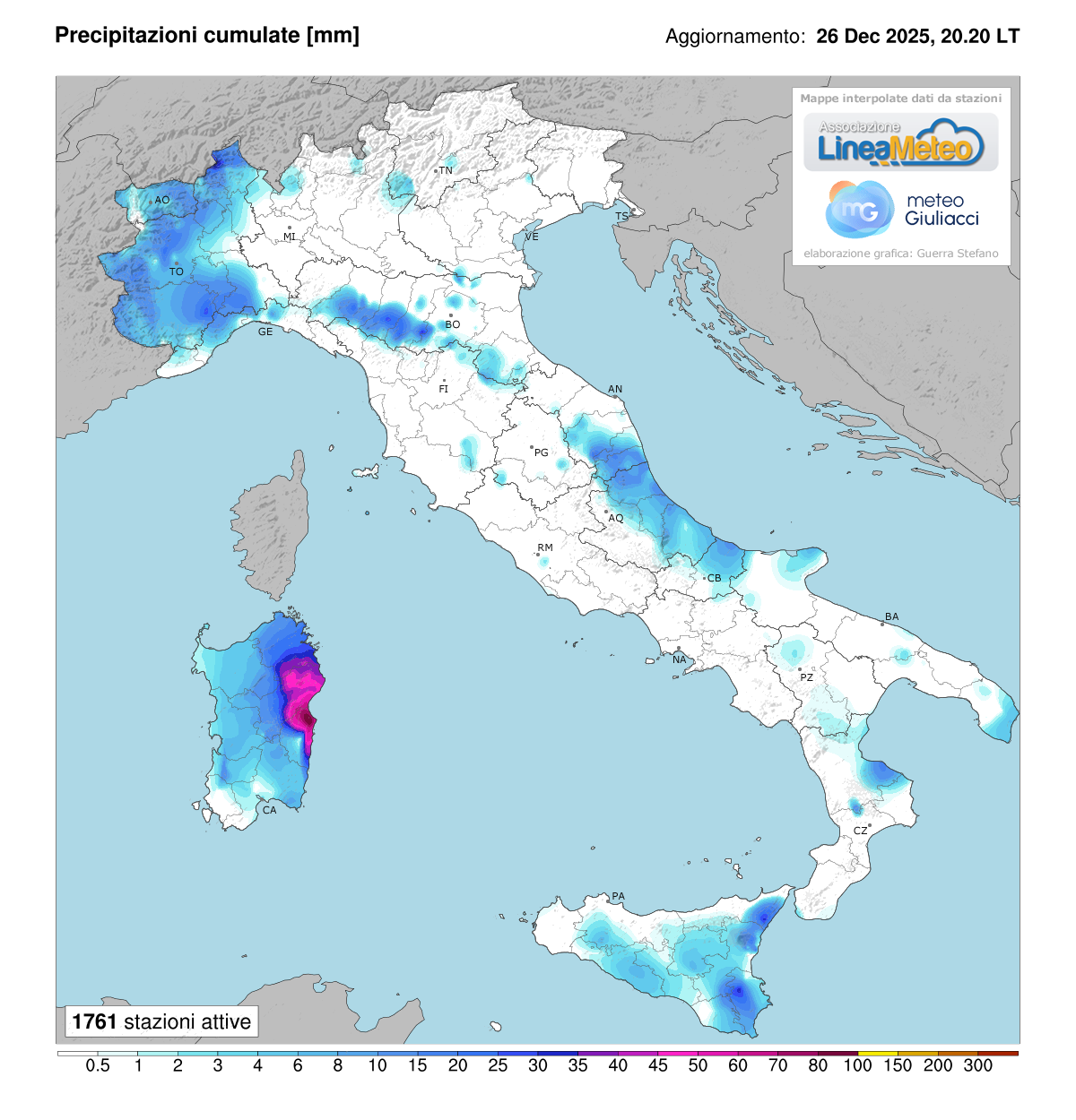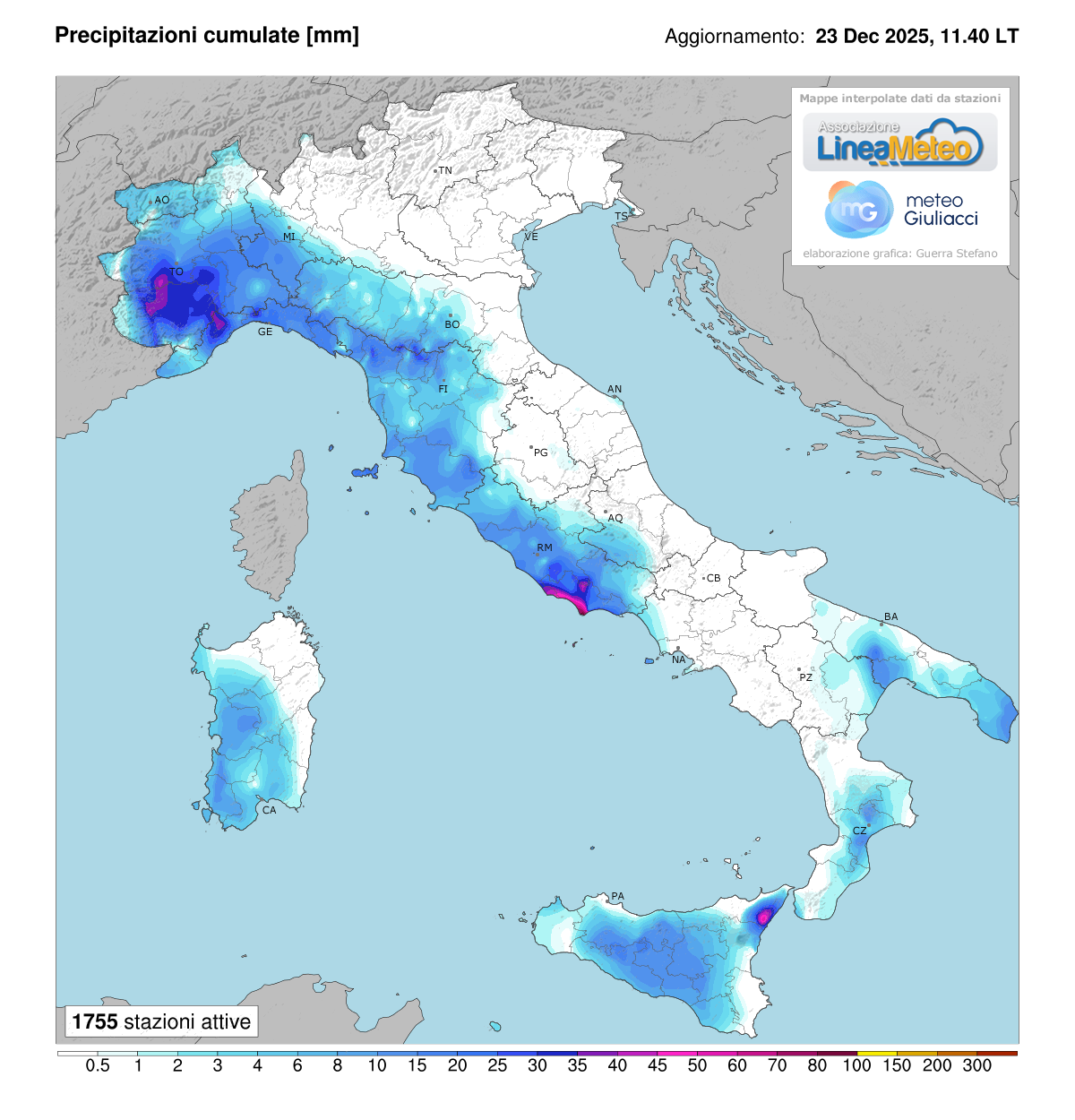 La mappa indica le precipitazioni accumulate oggi in Italia
