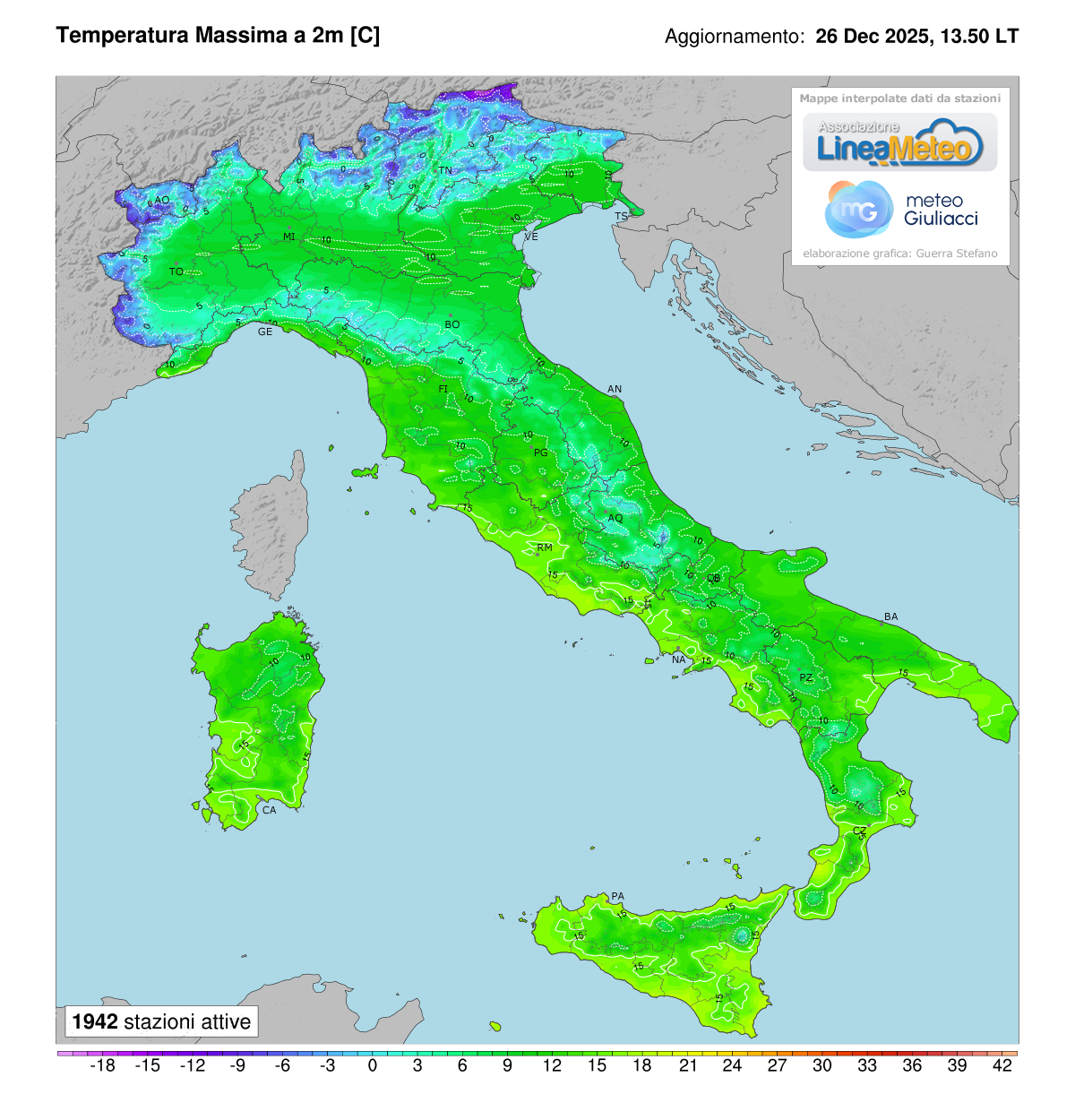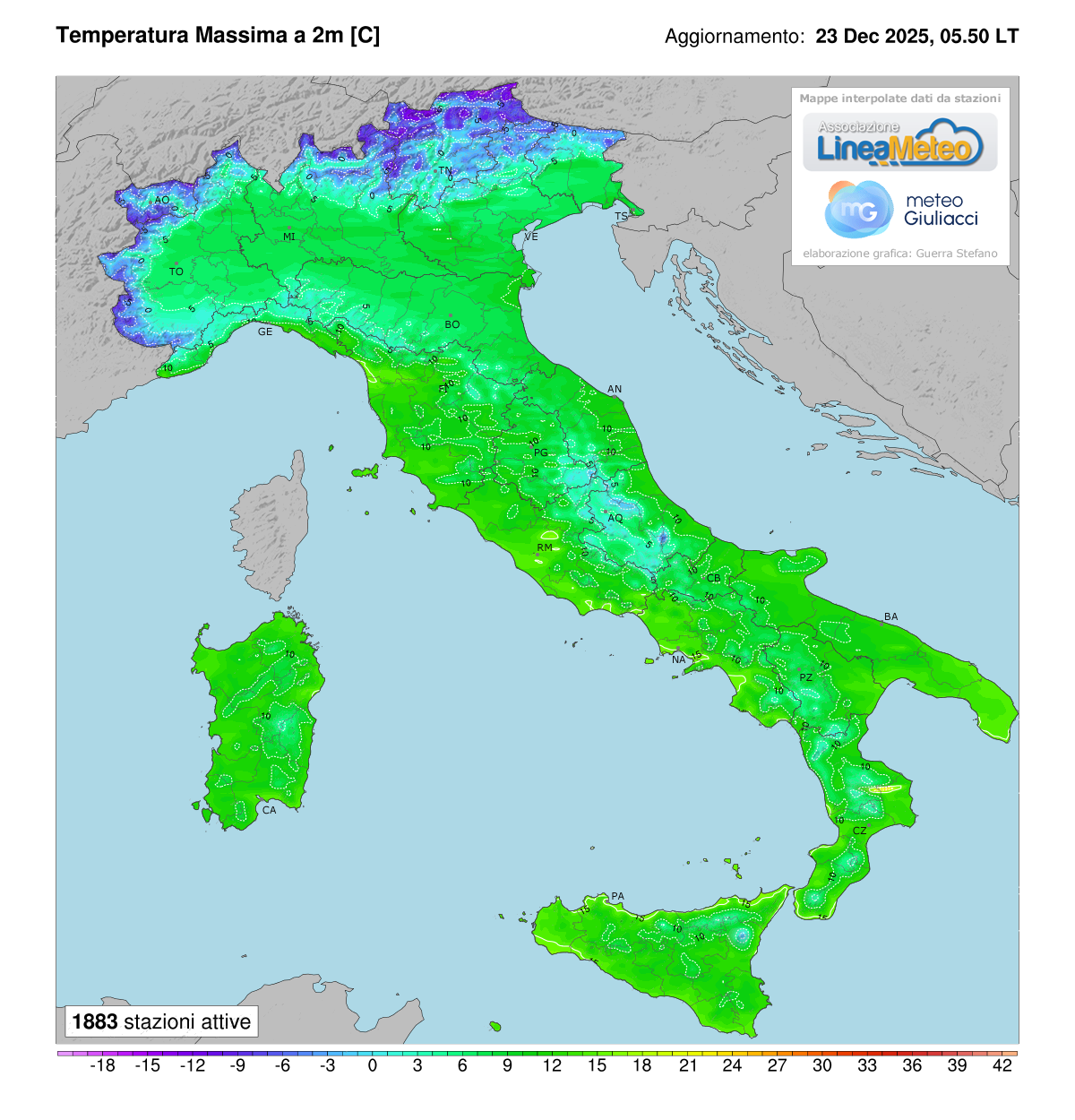 La mappa indica i valori massimi delle temperature registrate in Italia oggi