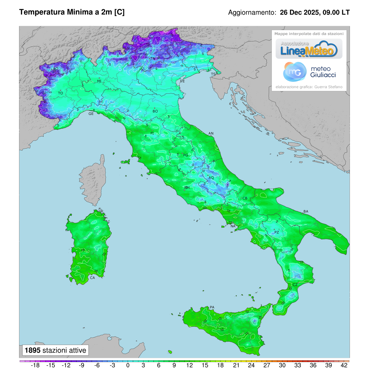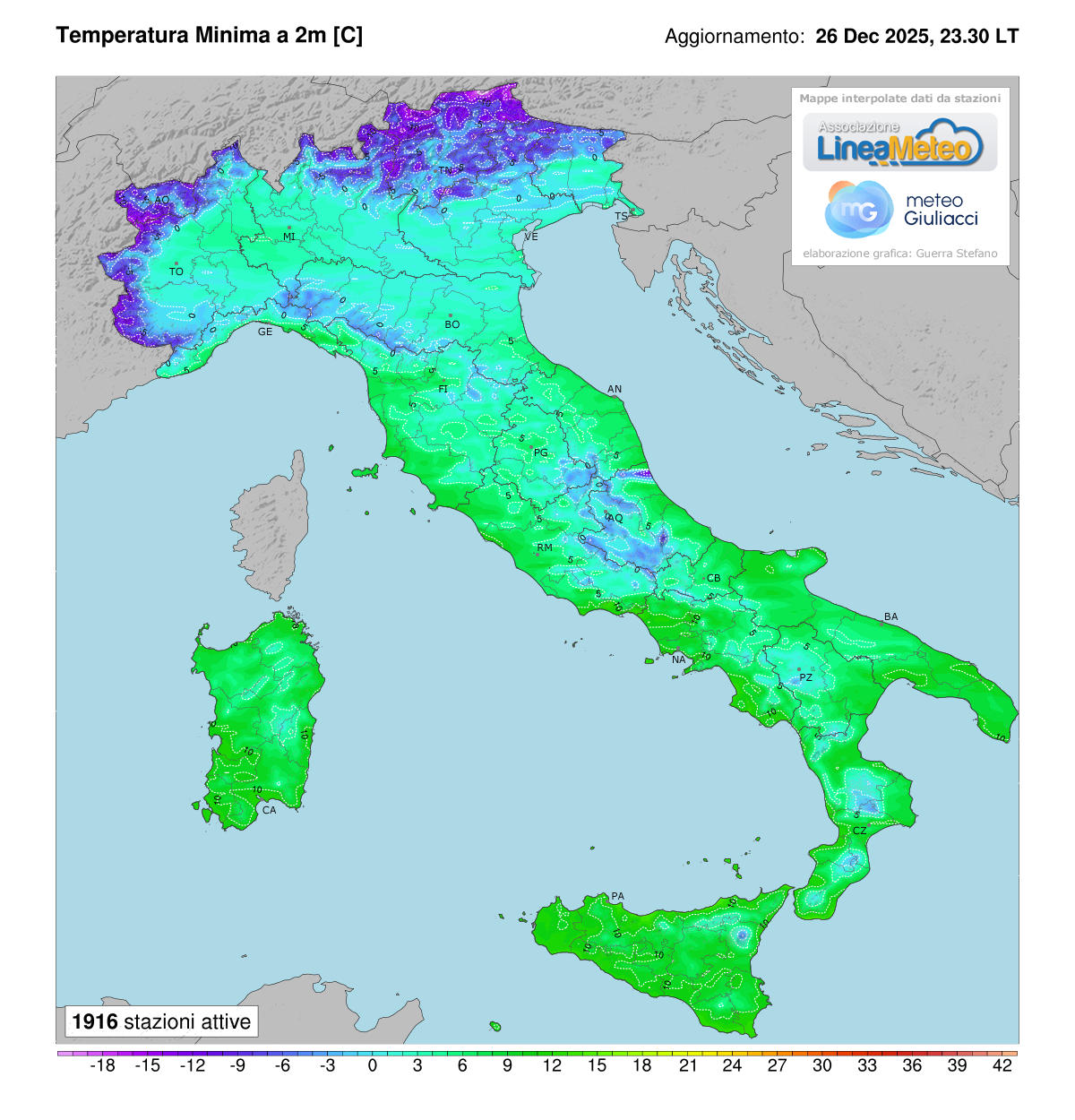 La mappa indica i valori minimi delle temperature registrate in Italia oggi