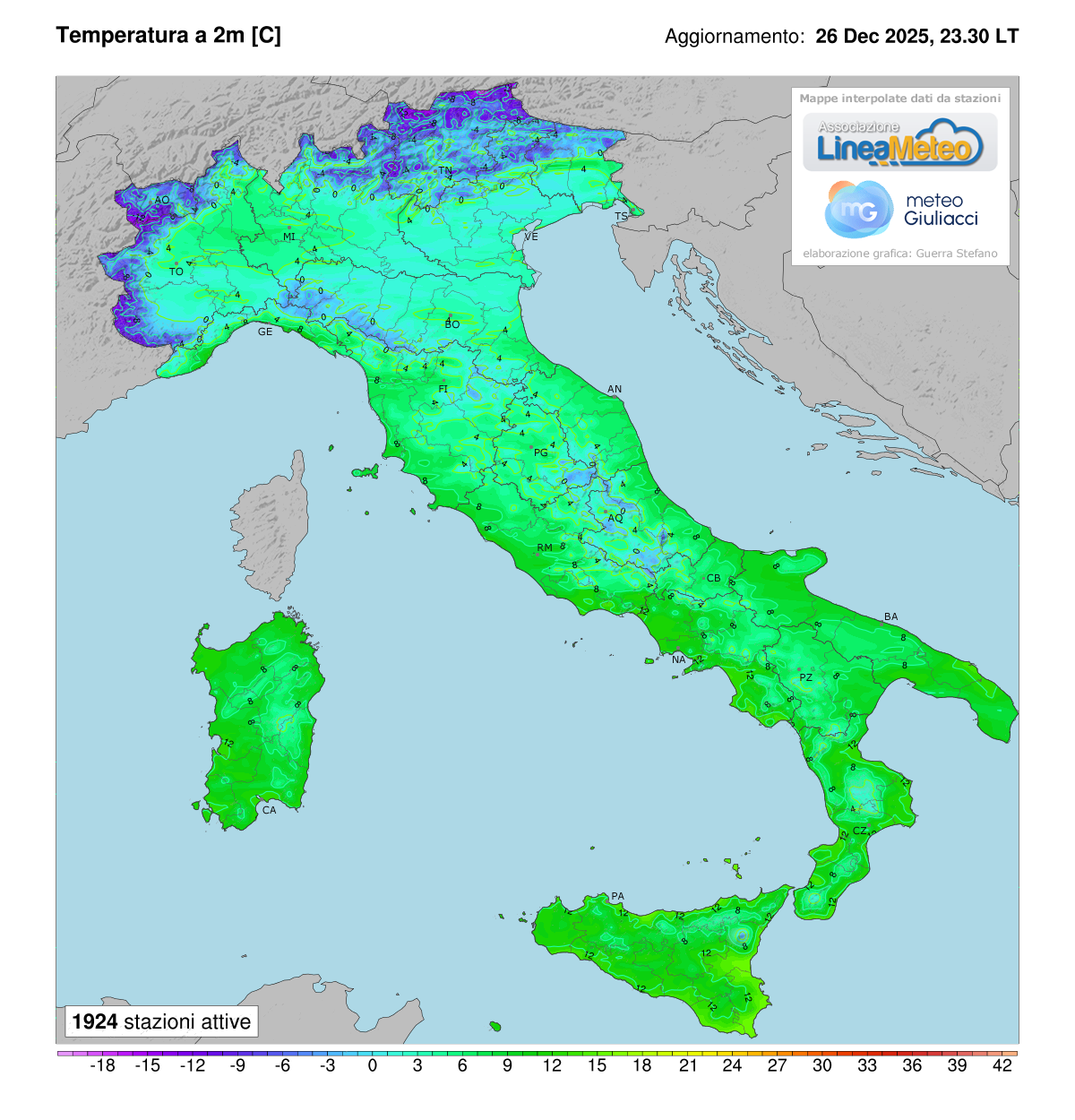 La mappa indica la situazione attuale aggiornata delle temperature registrate in Italia