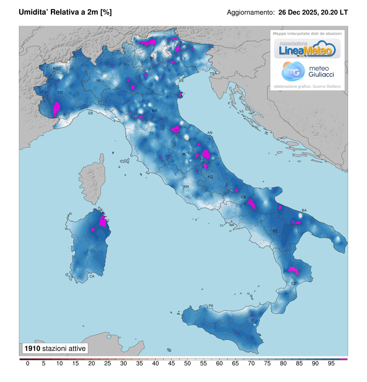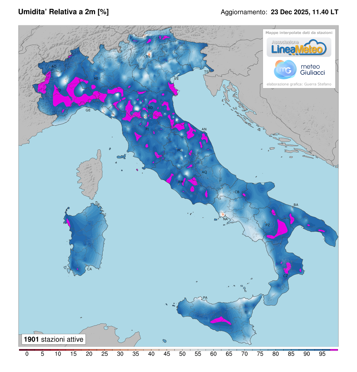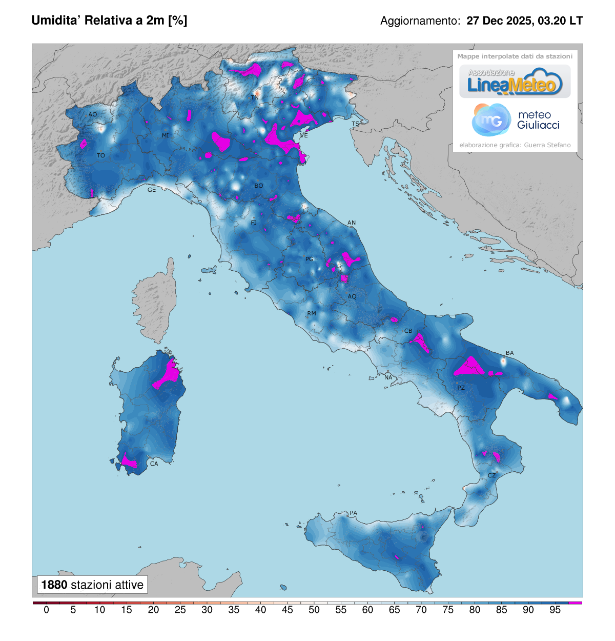 La mappa indica i valori di umidità relativa attuale registrata in Italia